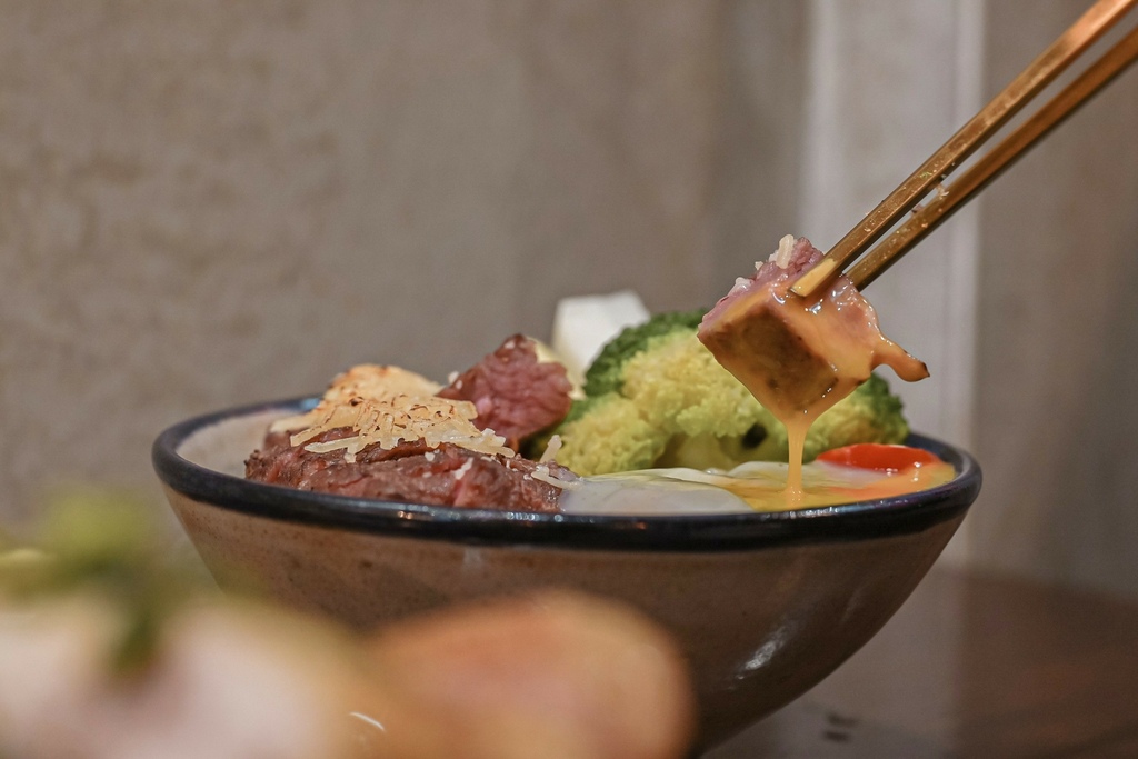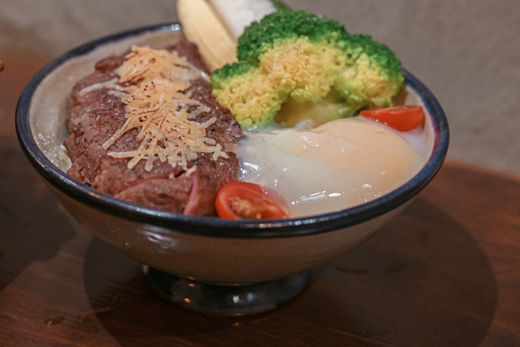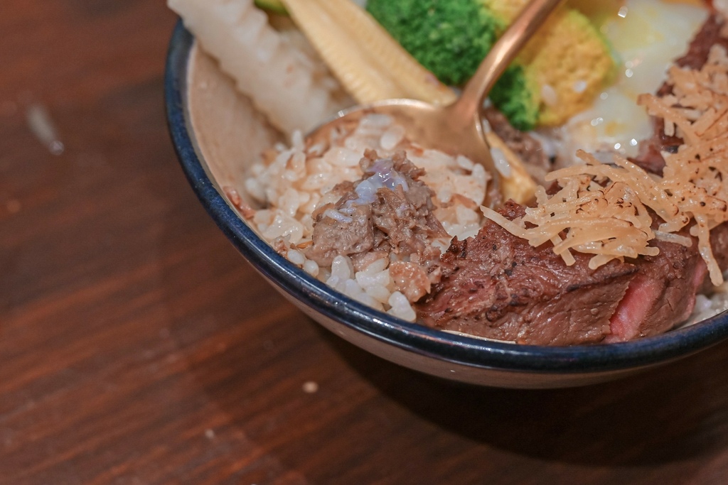 牛排也是經過舒肥法處理,色澤粉嫩,吃起來口感軟嫩富含肉汁,在嘴中咀嚼越咬越香,完全不塞牙縫,將軟嫩牛排沾上溫泉蛋液真是太誘人了,又是另外一種吃法與感受,正點!