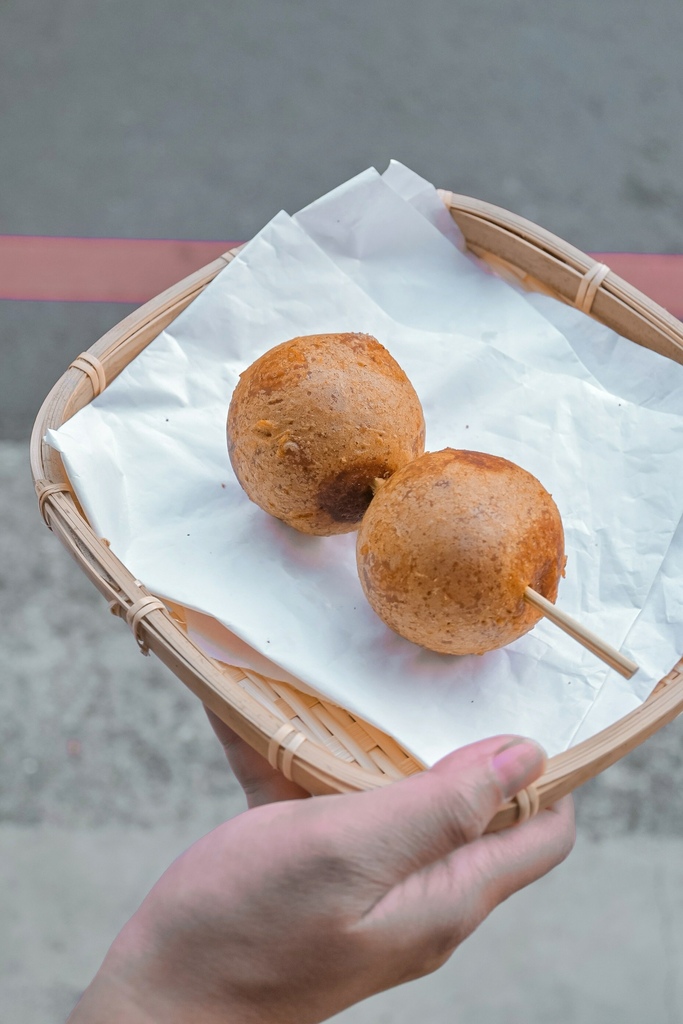 兩顆疊在一起就像巨大串丸子,外皮炸得酥酥脆脆,皮很薄不會很厚重,