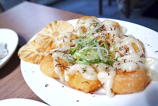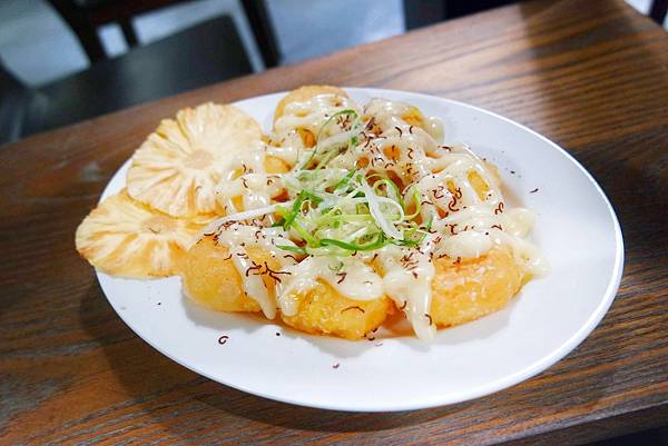 一旁附上乾燥鳳梨做裝飾,灑上美奶滋與蔥絲點綴,