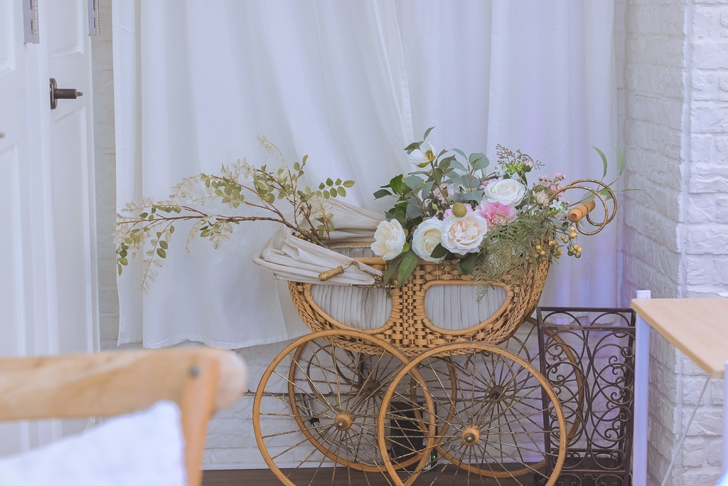 好喜歡透過玻璃窗從外往內看,婚紗服佐以花圈、花束、捧花和結婚小物等裝飾,流露出浪漫的氛圍,這次還發現禮盒除了既定湖水綠的禮盒,還多了小公主芭蕾粉色禮盒,有種甜甜的夢幻感。