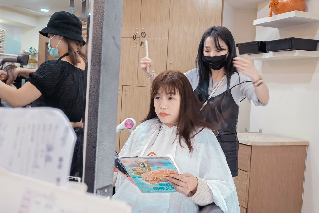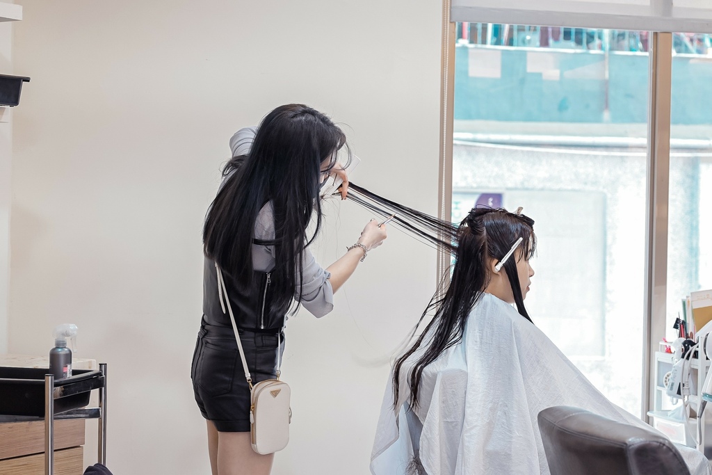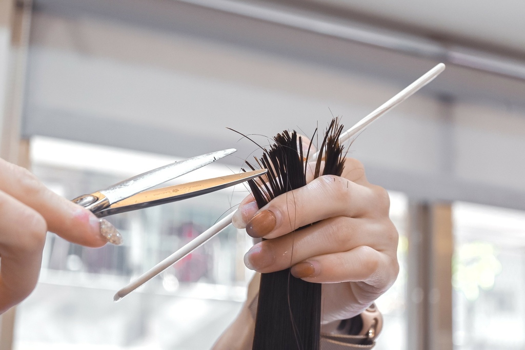 把頭髮分叉受損的地方修剪掉,還把厚重無層次的頭髮修剪整理,髮尾打薄層次,避免等等燙完後頭髮澎鬆彈不起來。