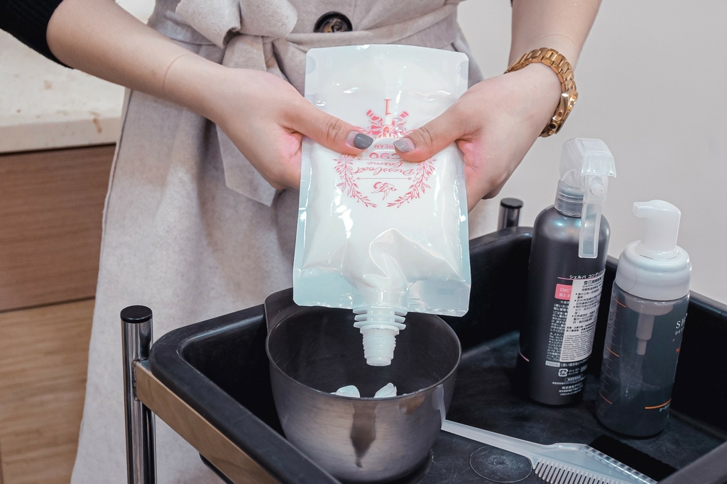 「燙髮前、燙髮中、與燙髮後護理」都是使用這兩罐「雪巴調護噴霧、雪巴調護乳」,迅速補給CMC給頭髮內部,使染燙的藥劑均勻發揮作用,同時抑制藥劑對受損部分過度滲透,難以受損、保持適當水平衡的狀態。