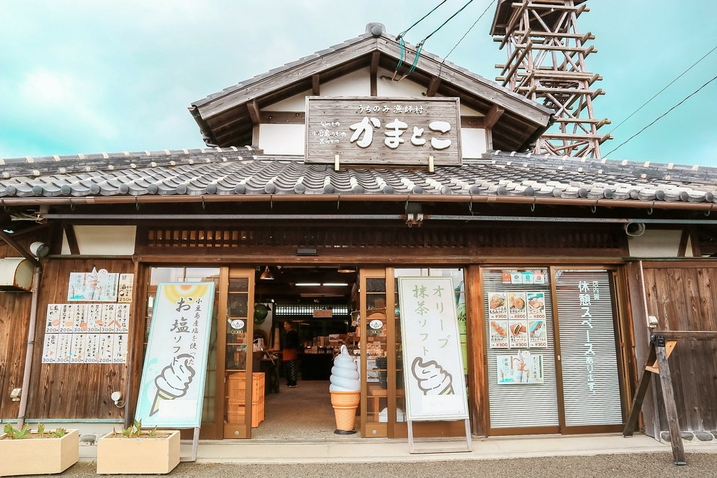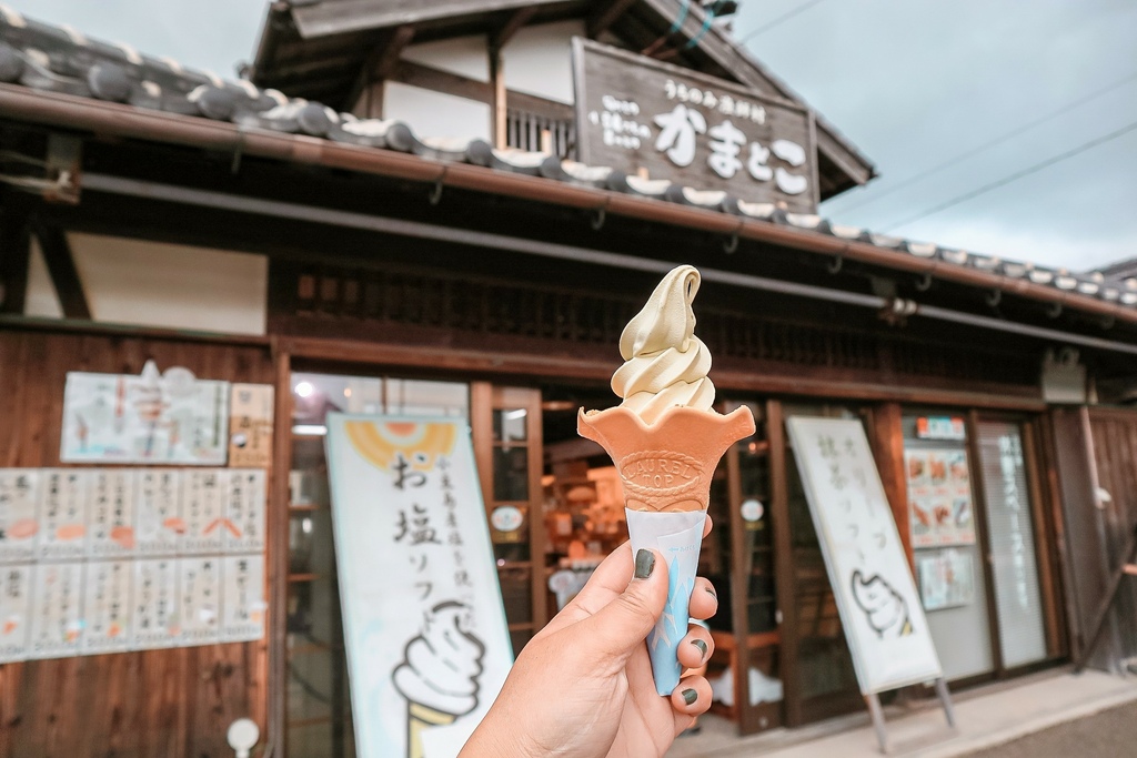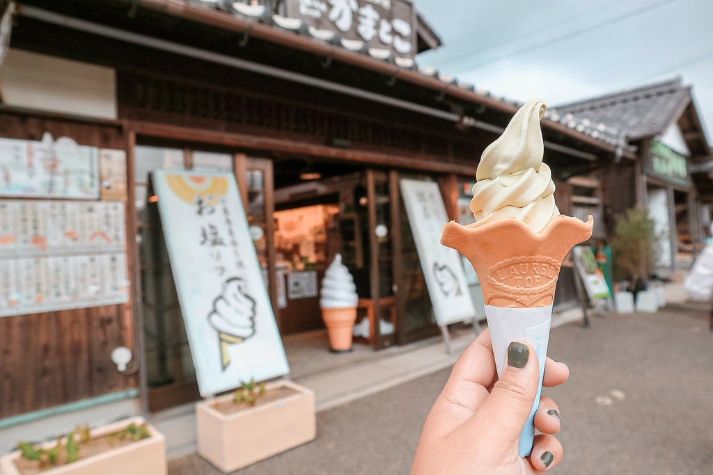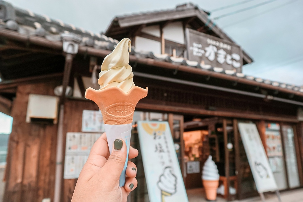 小豆島最有名的名物就是橄欖,來到這裡還必吃醬油口味冰淇淋,我們倆吃了丸金醬油記念館的醬油冰淇淋、一德庵香草淋上醬油口味冰淇淋,在最後要搭車離開小豆島才最後在「二十四之瞳電影村」對面的Kamatoko (かまとこ)吃到橄欖抹茶冰淇淋,口味真是特別呢!