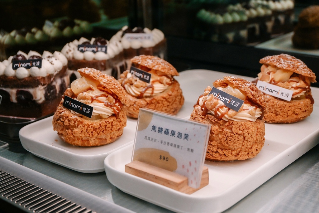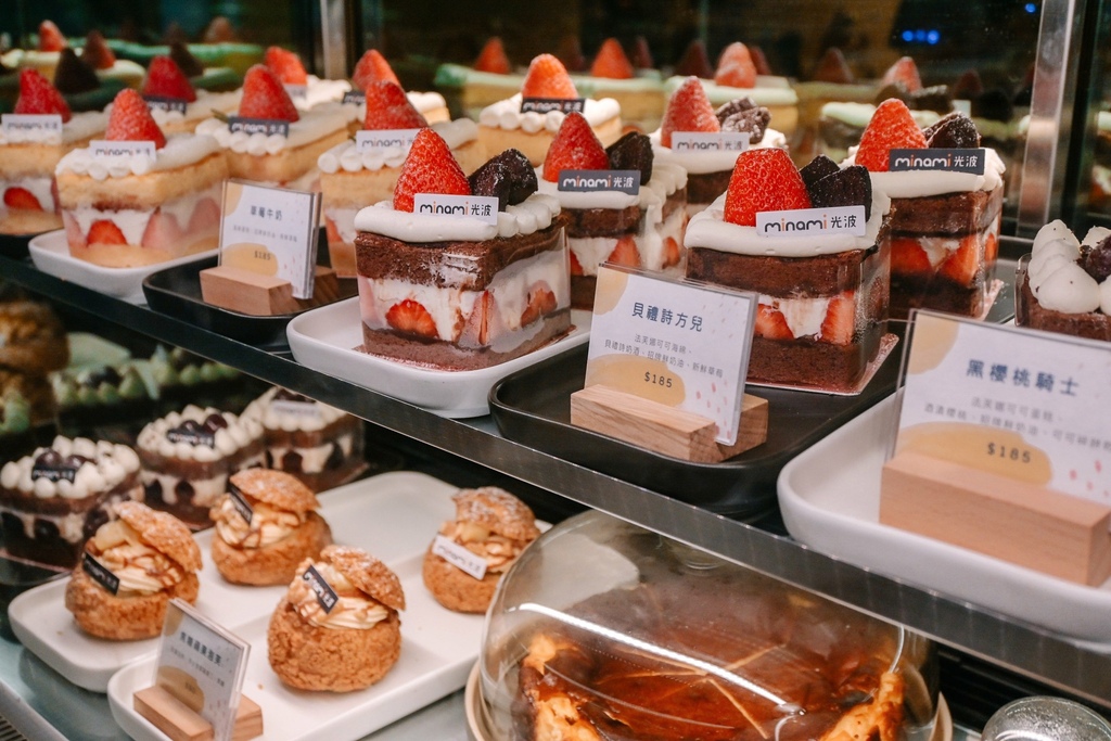 這次來就是為了Minami光波的甜點而來,此時正值草莓季,每一個蛋糕都讓我掉進戀愛陷阱裡,不知道該選那個好,還有黑櫻桃、泡芙、達克瓦茲等,價格從60~185元。