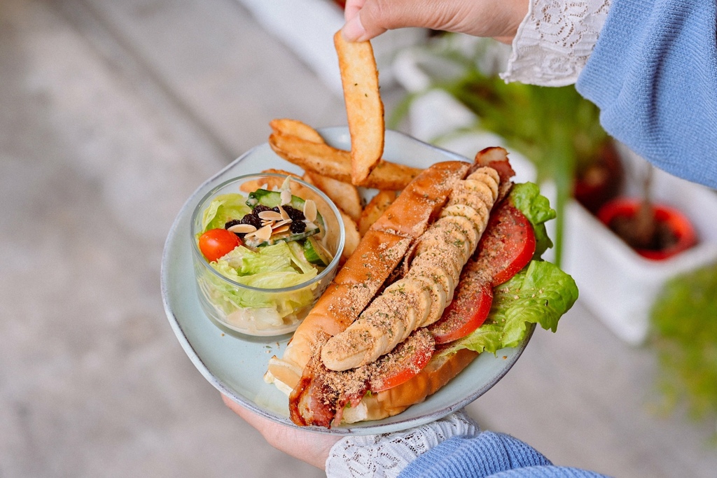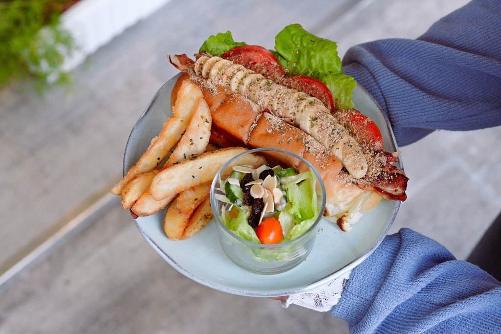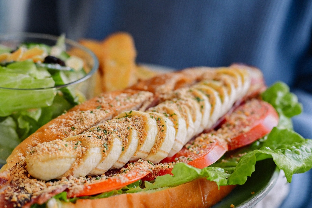 我非常喜歡貓王大明星夾入了生菜、番茄、培根、香蕉、花生粉與香菜末,整個超澎派,聞起來花生香濃,是有著台日混血的特製餐包。