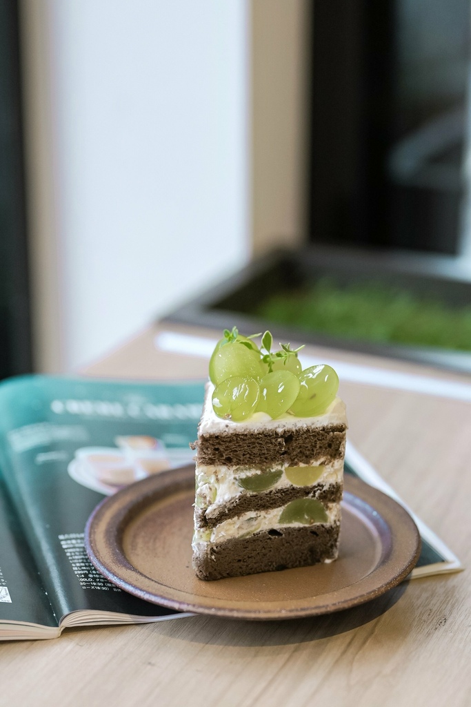 這款是又去蛋糕櫃上巡邏一番後看到(笑),焙茶蛋糕體配上鮮奶油與有點酸甜感的青葡萄,焙茶蛋糕體淡淡茶香,與滑順好入口的鮮奶油潤滑了整體,非常清爽,價格又很平實,是我超推薦來這必點的一款甜點。
