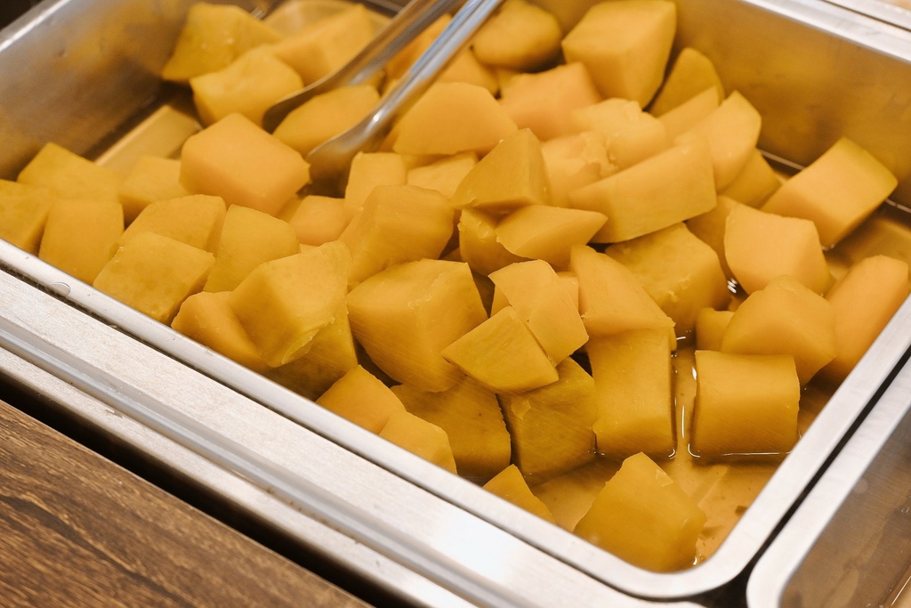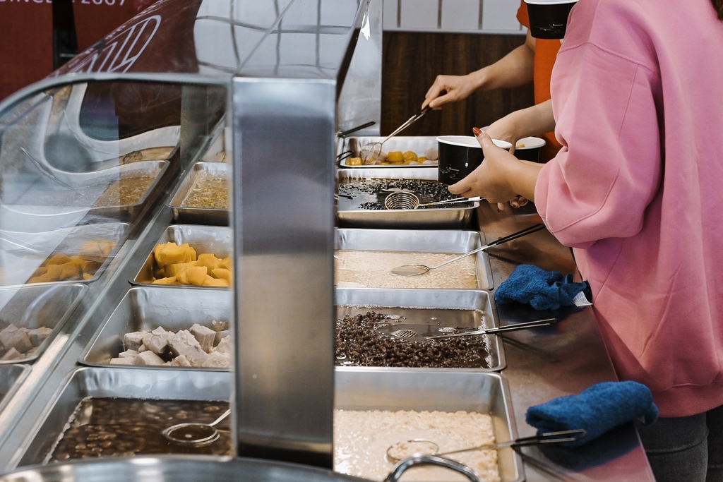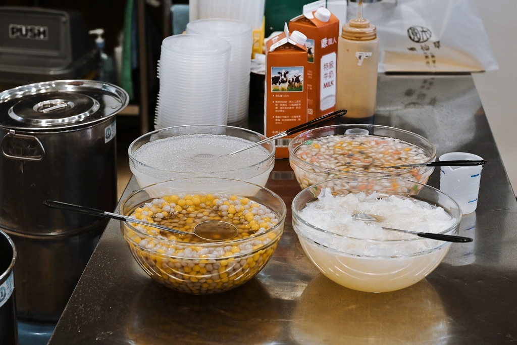 櫃台旁透明櫥櫃擺放了許多配料區像是芋頭、地瓜、芋圓、地瓜圓、西米露、綠豆、薏仁、紅豆、綠豆、花生、珍珠、QQ等,每一種都是店家手工熬煮,而且不光是地瓜圓、芋頭圓那麼大顆,就連地瓜和芋頭都切超大塊。