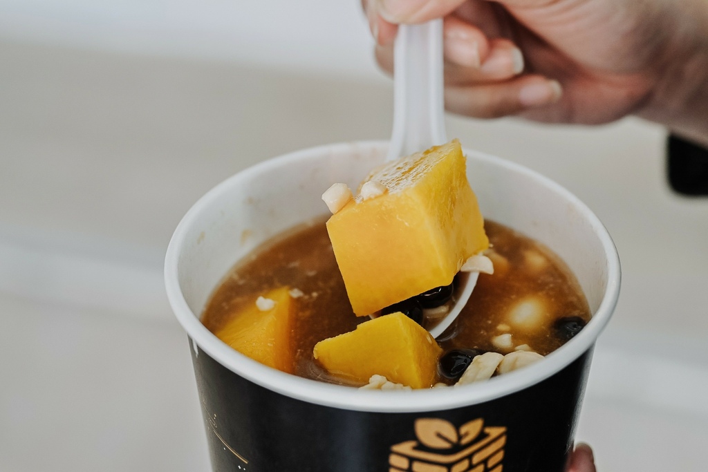 除了圓仔還可任選配料三種,選了地瓜、珍珠和花生,圓仔的口感有點軟糯帶點咬勁,很傳統單純糯米滋味,配上香甜鬆軟地瓜,綿密花生、較有嚼勁的珍珠,就是獨一無二擁個人喜好的綜合圓仔甜湯。