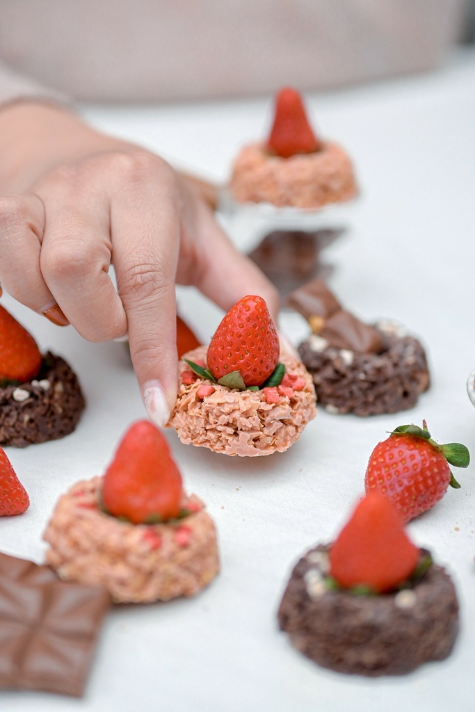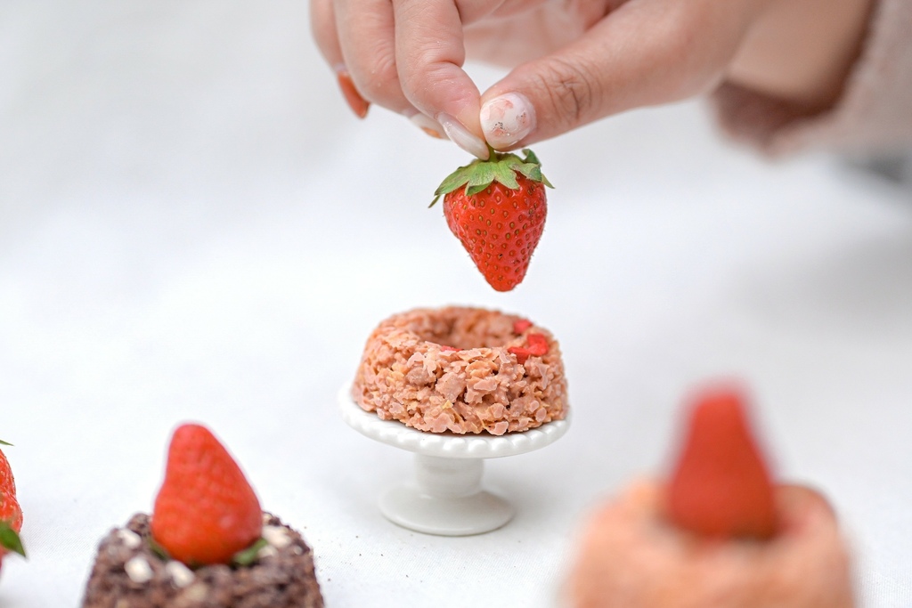 莓果脆片以玉米脆片搭配餅乾脆片為基底,配上酸酸甜甜充滿幸福滋味的草莓,還撒上新鮮草莓製成的草莓丁,增添不少可愛感。