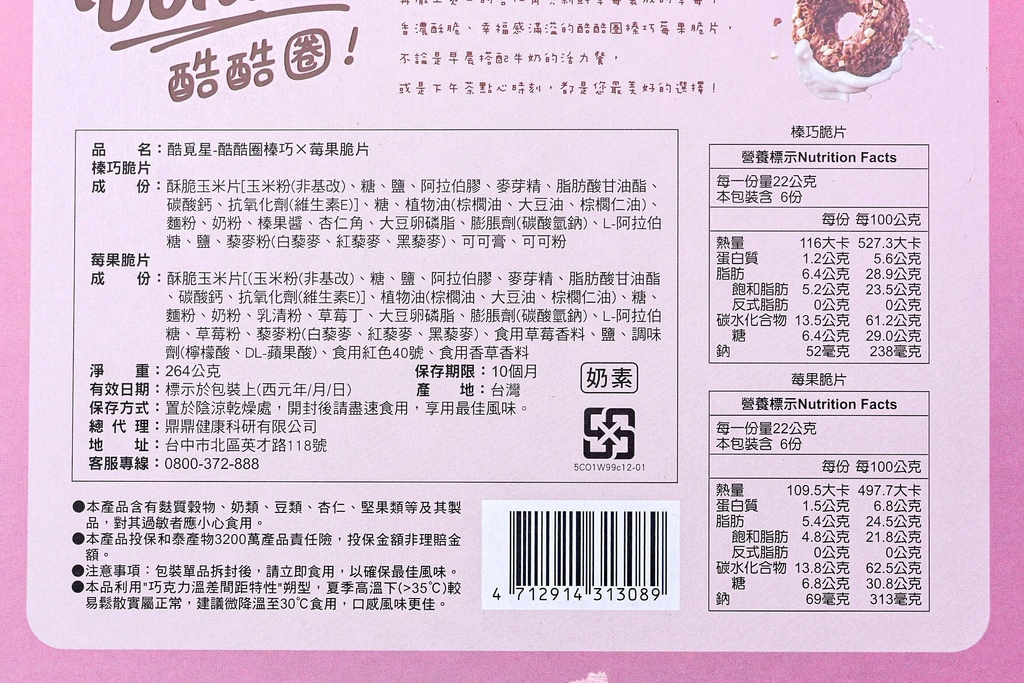 【我說】酷覓星酷酷圈內有二款口味:榛巧脆片、莓果脆片,草莓口味與巧克力口味甜度很剛好不會太甜膩,酥酥脆脆好可口。