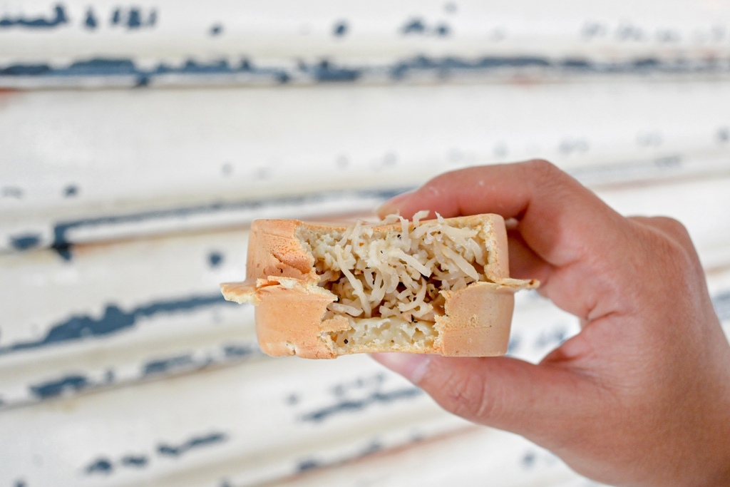 點一個試看看,選了蘿蔔絲口味,一拿到手就可以感受到紅豆餅非常薄又很酥脆,蘿蔔絲沒有太多的調味,吃起來較清爽不油膩,配上超薄脆的皮,古早味十足。